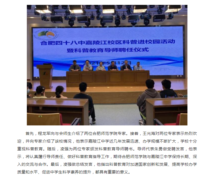 本网讯 5月12日下午,合肥四十八中嘉陵江校区(简称:嘉陵江中学)科普进校园活动暨科普教育导师聘任仪式在嘉陵江中学蕴华楼五楼报告厅举行。beat365在线唯一官网生命科学学院欧祖兰副教授和朱勇副教授应邀开展科普教育活动,并受聘为嘉陵江中学科普教育导师。嘉陵江中学校党支部书记、校长凌强,副校长王光海出席活动,活动由生命科学学院副教授、嘉陵江中学挂职副校长王占军搭建合作平台,嘉陵江中学科研处主任程龙军主持导师聘任仪式。