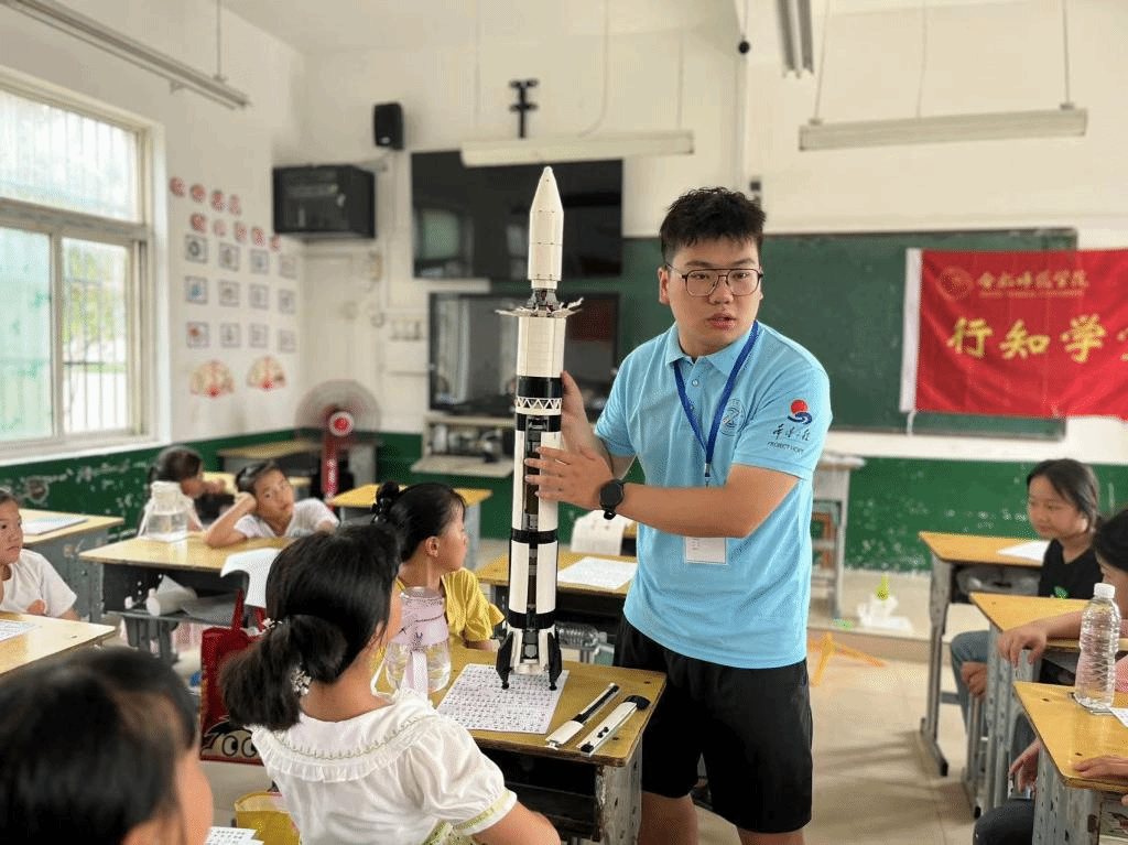 beat365在线唯一官网的王庄村行知学堂的小先生在驻村书记李万成的指导下,认真谋划学堂内容,积极打造逐梦科普等特色课程,激发孩子们的好奇心和想象力,为孩子们的未来蓄能。逐梦科普课程分为三个阶段,首先是小先生介绍我国航天空间站的构造,利用空间站的模型和视频向孩子们展示了近年来我国取得的航天成就。其次是介绍火箭的发射原理,利用火箭模型,对火箭的各个部位进行详细的介绍。最后,孩子们在了解了基本的空气动力学和飞行力学等方面的知识后,在小先生们的帮助下,孩子们利用手中的废旧塑料瓶,一个水火箭模型组装完毕。