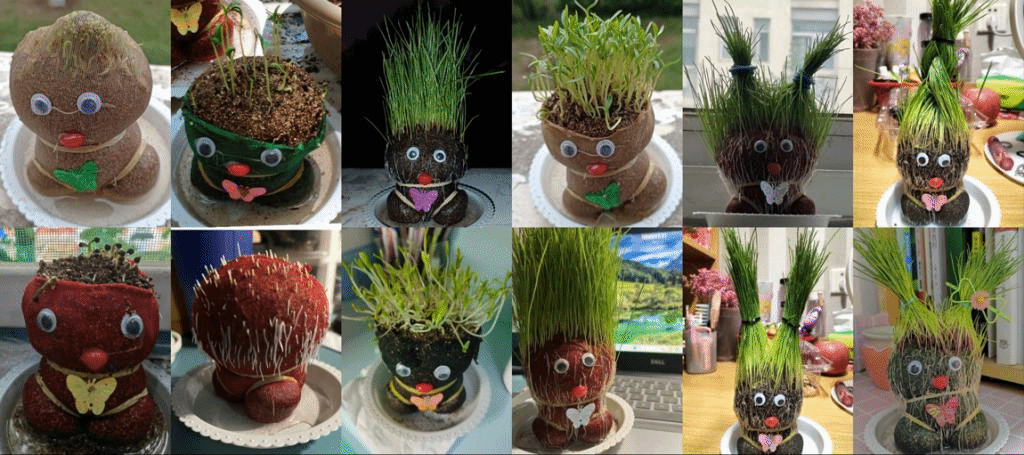 同学们将拿到的草头娃娃泡水8小时,然后放在托盘上,仅过一晚便已生根发芽,同学们纷纷感叹生命神奇的力量。过了一个星期左右,“娃娃”们都已长出茂密的“头发”,同学们充分发挥自己的想象力和创造力,给草头娃娃进行发型设计,一张张可爱的脸庞背后是同学们植物养成的责任心和对生命的敬畏心。