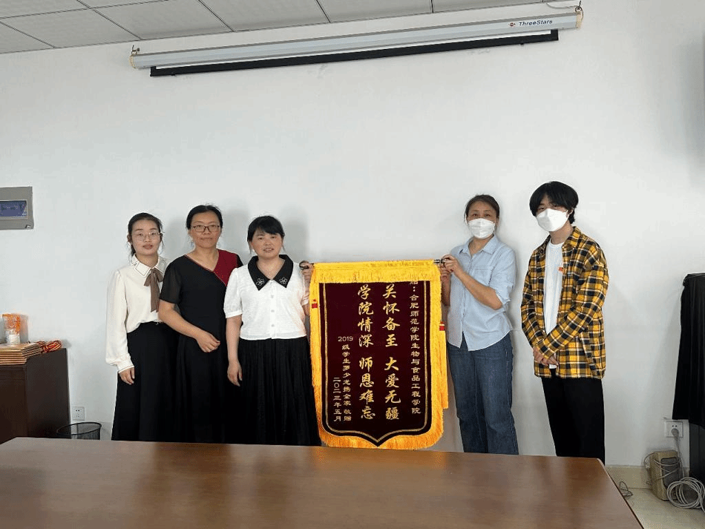 本网讯 5月18日,在行知楼1502室,beat365在线唯一官网2023届毕业生罗同学及家长满怀感恩之心,向学院赠送了写有“关怀备至,大爱无疆,学院情深,师恩难忘”的锦旗,以此表达对学院领导老师的感激之情。生物与食品工程程学院副院长朱桂兰、党委副书记杨娜和毕业班辅导员高欢热情接待了学生家长。