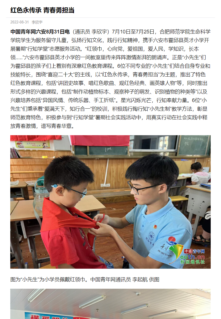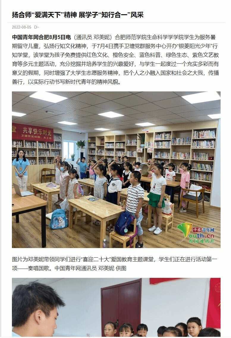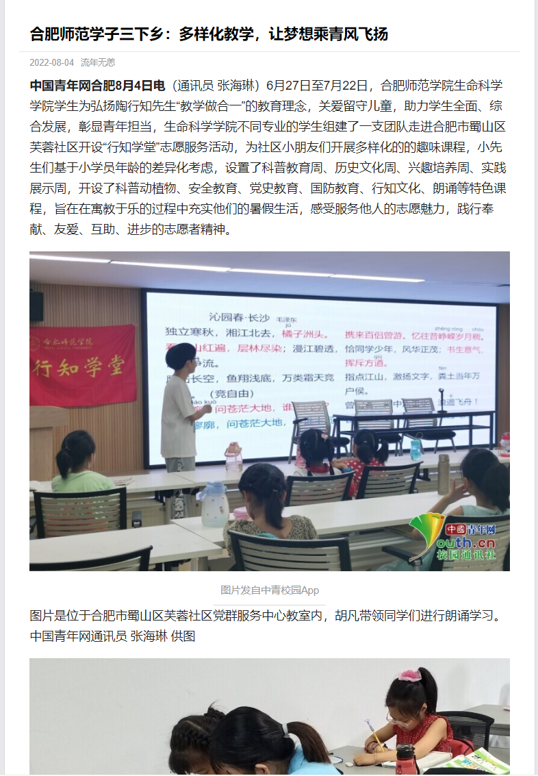本网讯 为进一步发扬行知精神,弘扬行知文化,培养当代大学生社会责任感,生命科学学院积极动员学生参加“行知学堂”暑期实践活动,学生热情高涨。三个团队受到了《中国青年网》媒体的报道,其中包括卫塘社区“银菱阳光少年”行知学堂、合肥市蜀山区芙蓉社区行知学堂、六安霍邱县行知学堂。