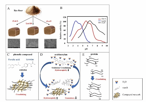 黑麦面包以其高营养价值而备受青睐,但因其面团粘性强、质地缺乏弹性等问题,影响了其市场接受度。漆酶作为一种绿色生物酶,能够修饰小麦和无麸质面粉产品的关键成分,从而有望改善其质量。然而,关于真菌漆酶在黑麦面包中的应用及其改善效果尚未被系统研究。该研究首次系统比较了三种不同来源的真菌漆酶在黑麦面包加工中的应用效果,综合低场核磁共振(LF-NMR)、傅里叶变换红外光谱(FTIR)和扫描电镜(SEM)等多维度分析技术,阐明了漆酶通过增强面团水结合能力、改变蛋白质二级结构并催化二硫键形成以优化网络稳定性的作用机制。
