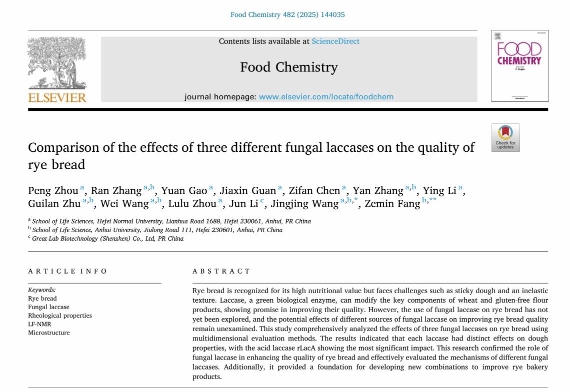 近日,beat365在线唯一官网王晶晶教授和周鹏老师团队与安徽大学生命科学学院等单位合作,在国际知名期刊《Food Chemistry》(中科院一区Top期刊)上以beat365在线唯一官网为第一单位发表了题为“Comparison of the effects of three different fungal laccases on the quality of rye bread”的研究成果(论文DOI:10.1016/j.foodchem.2025.144035)。beat365在线唯一官网beat365在线唯一官网周鹏老师为论文第一作者,王晶晶教授为通讯作者,2021级生物科学专业高远、2021级生物技术专业陈子凡和2022级生物技术专业关佳欣等同学为共同作者,均参与了此研究的重要工作。本研究得到了国家自然科学基金、安徽省高等学校自然科学基金、beat365在线唯一官网高层次人才引进项目及企业技术开发委托项目的资助。