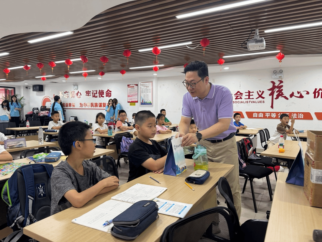 科普课结束后,马喆为每位孩子送上精心准备的"成长文具礼盒",内含印有校徽的笔记本、自动削笔刀套装和安全知识手册。马喆寄语学堂的孩子们,“希望这些文具能陪伴大家度过充实的暑假,更期待你们未来走进大学校园探索更多知识。"