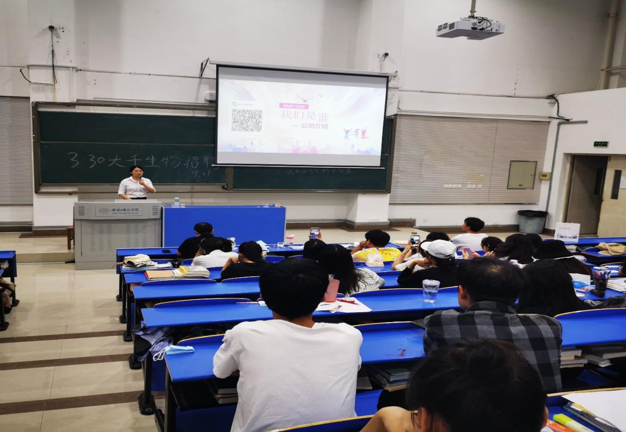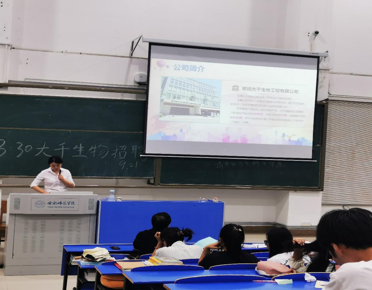 本网讯 为更好地拓宽毕业生就业渠道,大力构建毕业生与用人单位的交流平台,生命科学学院于9月21日下午在逸夫楼西阶一教室举行了安徽大千生物工程有限公司招聘宣讲会。生命科学学院党委副书记杨娜、实践教学部主任张雁、毕业班辅导员高欢出席了本次宣讲会。2023届生物技术、生物制药、生物科学专业的毕业生参加了招聘宣讲会。