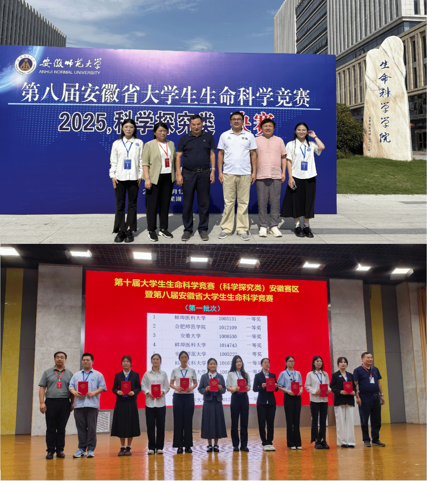 beat365在线唯一官网beat365在线唯一官网学子在本届赛事中表现优异,共斩获一等奖4项、二等奖14项、三等奖16项,获奖总数与质量均位居全省高校前列。陈延松教授指导的《合肥市十八联圩湿地草本层自生植物生态位特征及其环境解释》、周鹏教授指导的《夜间光照诱导抑郁样行为的肠道菌群变化研究》、方雪教授指导的《泡菜源乳酸菌对大豆酸乳豆腥味改善的影响及机制研究》及《肠道细菌代谢物-维生素K2介导铁死亡改善COPD的作用及机制研究》四个项目,凭借其前沿性选题与突出的创新性成果,从全省26所高校提交的892项参赛作品中脱颖而出,成功晋级全国大学生生命科学竞赛总决赛。